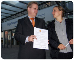Leider bedeutete das für die HypoVereinsbank „keinen grundsätzlichen Ausstieg aus der Finanzierung von Atomkraft“, wie sie in dem Fax an Urgewald schrieben. Aus diesem Grund übergab Trudel Meier-Staude von projekt21plus im Namen vieler Münchner Umweltgruppen einen offenen Brief an den HVB-Vorstand Profumo, vertreten durch Herrn Löbbert (Direktor des Corporate Social Reibility Management).